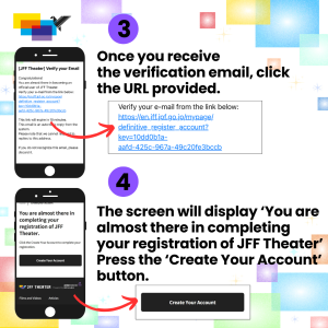 ④ You’ll see a message that says, ‘You are almost there in completing your registration of JFF Theater.’ Simply press ‘Create Your Account’—and you’re all set!