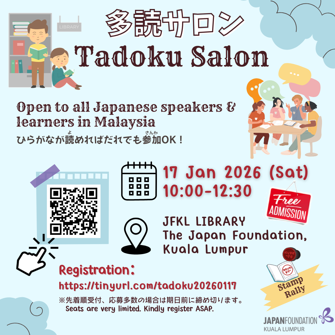 Find out more »The JFKL Tadoku Salon is back! π Date: 17 Jan 2026 (Saturday) π Time: 10:00am-12:30pm π Venue: JFKL Library This event is open to all...