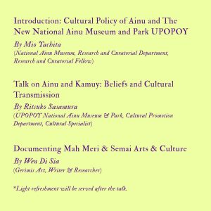 The session begins with Ms. Mio Yachita, a researcher and curatorial fellow at the National Ainu Museum, who will provide an introduction to the cultural policy of the Ainu people and the establishment of the UPOPOY National Ainu Museum & Park in Hokkaido. This will be followed by a talk by Ms. Ritsuko Sasamura, a cultural specialist from UPOPOY, who will explore Ainu beliefs, their connection to Kamuy (spiritual beings), and the transmission of cultural practices. Closing the event, Wen Di Sia from Gerimis Art will share insights into documenting the arts and culture of Malaysia’s Mah Meri and Semai communities, drawing parallels between efforts to preserve Indigenous traditions in Japan and Malaysia.