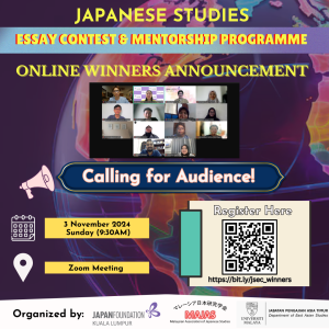 The Japan Foundation, Kuala Lumpur (JFKL) encourages our youth to share their knowledge and fresh opinions on important topics related to Japan and Japanese studies. THE JAPANESE STUDIES ESSAY CONTEST AND MENTORSHIP PROGRAMME, in collaboration with The Malaysian Association of Japanese Studies (MAJAS) and the Department of East Asian Studies, Universiti Malaya is a one-of-a-kind project that seeks out intriguing submission of Abstracts (400 words-in English) from Undergraduate students studying at any University or other tertiary education institution in Malaysia.