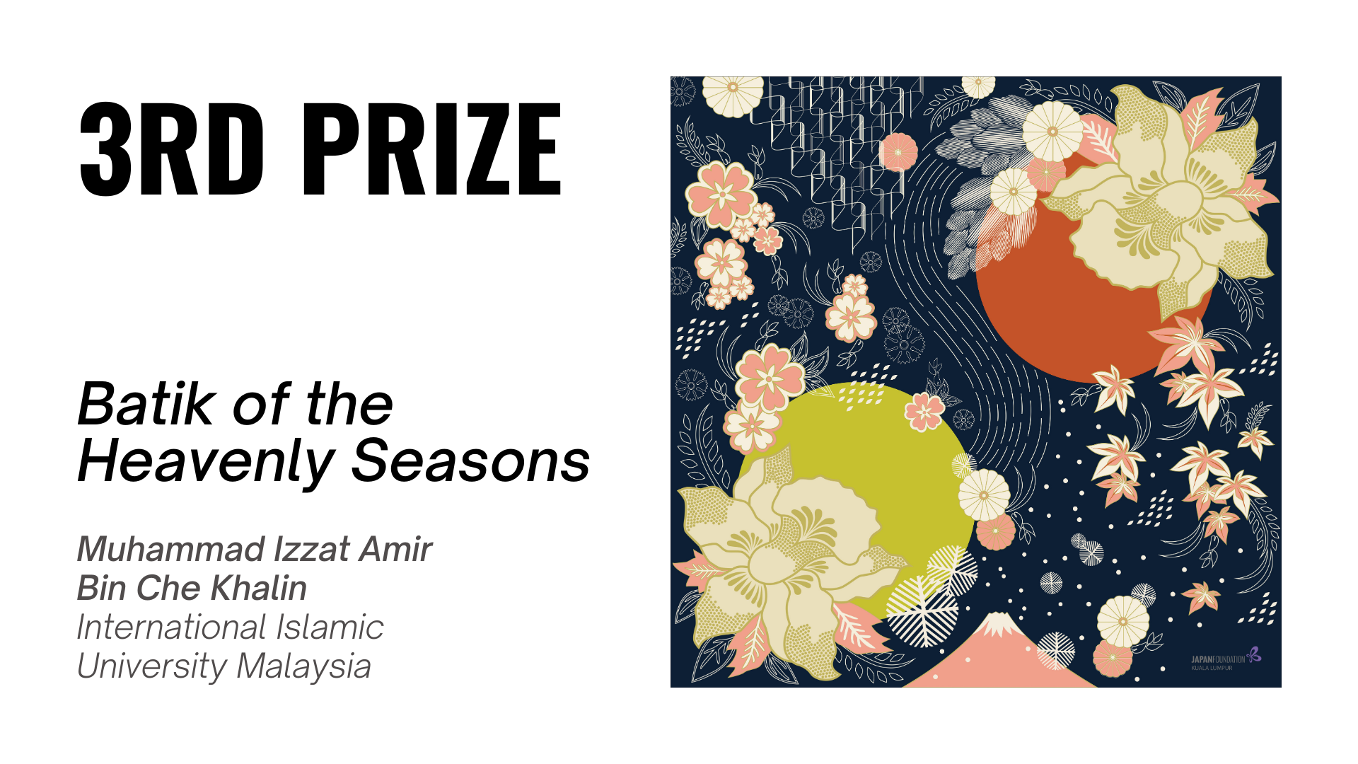 We are proud to announce the Japan Foundation, Kuala Lumpur have successfully organised the inaugural “Furoshiki Design Contest” open to all arts and designs students in Malaysia aged 18 and above. Out of the overwhelming 136 submissions received, and after a long discussion, the judges have agreed and selected 3 winners for this contest. Congratulations to the winners and participants for their wonderful submissions and unique interpretation of the theme “Malaysia+Japan”. Read the judges’ comments on the three winning designs as well!