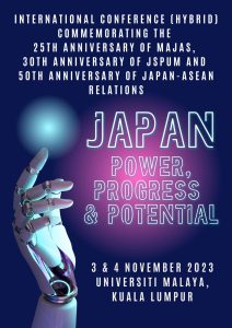 Accordingly, to commemorate these three historic events, MAJAS which is the main platform representing Japan studies experts in Malaysia has taken the initiative to organize an international conference in a 3-in-1 format. This conference will bring together educators, researchers, alumni and policy makers within and outside of Malaysia to share their insights on wider Japan. Over the years, MAJAS has not only extended its relations with Japanese Studies Association in ASEAN (JSA-ASEAN), it also has collaborations with other like-minded Japan studies associations in Australia, Europe and America. The conference will serve as a platform for bringing together Japan experts in sharing synergies and solutions in empowering Japan studies domestically as well as globally. To this end, Japan Studies in Malaysia serves as a springboard to start the conversation here in ASEAN. Therefore, the main theme of the conference is “JAPAN: POWER, PROGRESS AND POTENTIAL”.