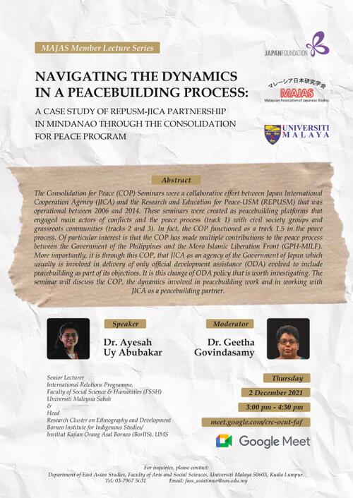 The Consolidation for Peace (COP) Seminars were a collaborative effort between Japan International Cooperation Agency (JICA) and the Research and Education for Peace-USM (REPUSM) that was operational between 2006 and 2014. These seminars were created as peacebuilding platforms that engaged main actors of conflicts and the peace process (track 1) with civil society groups and grassroots communities (tracks 2 and 3). In fact, the COP functioned as a track 1.5 in the peace process. Of particular interest is that the COP has made multiple contributions to the peace process between the Government of the Philippines and the Moro Islamic Liberation Front (GPH-MILF). More importantly, it is through this COP, that JICA as an agency of the Government of Japan which usually is involved in delivery of only official development assistance (ODA) evolved to include peacebuilding as part of its objectives. It is this change of ODA policy that is worth investigating. The seminar will discuss the COP, the dynamics involved in peacebuilding work and in working with JICA as a peacebuilding partner.