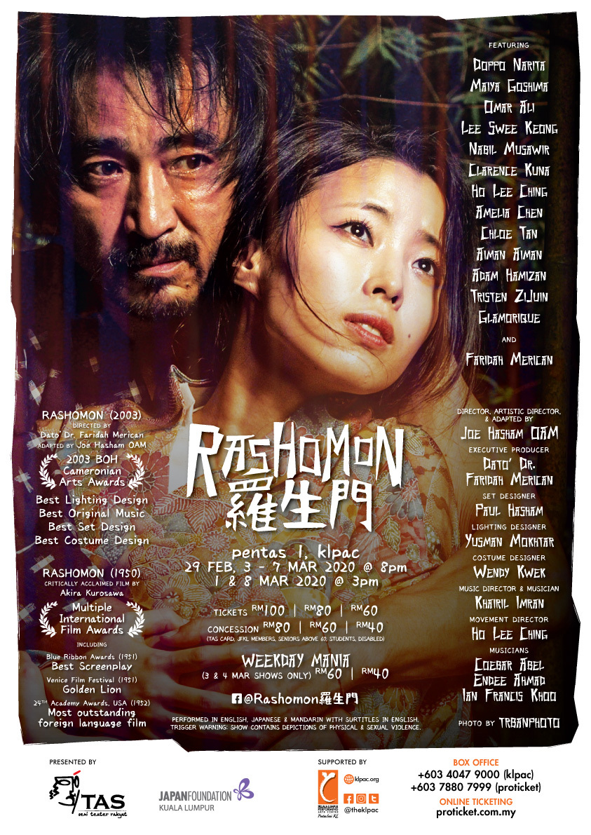 Featuring a stellar cast featuring both foreign and local actors including Narita Doppo, Goshima Maiya, Lee Swee Keong, Omar Ali, Faridah Merican; directed and designed by Joe Hasham OAM, Rashomon 2020 will be presented as a trilingual production (Japanese, English and Mandarin), and aims to be the perfect reflection of our past and our future, a display of multiculturism at its best that is evident in 21st Century society where borders are increasingly erased.