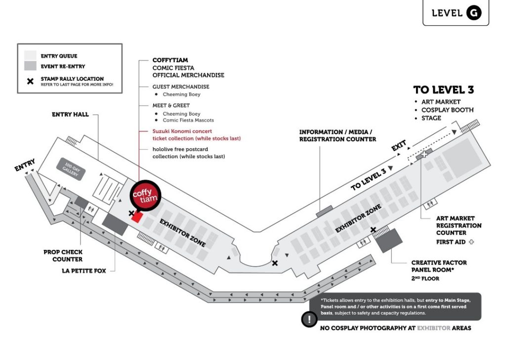 ADMISSION/TICKETING Free for Comic Fiesta 2022 attendees. An additional concert ticket is required to join the concert and can be collected at the event. Concert tickets can be redeemed at “coffytiam” booth at Exhibition Hall 5, G floor, from 17 December, 9:30 AM onwards (refer to map below). Kindly note that 1 (ONE) ticket can only be redeemed by 1 (ONE) person, and distribution will end when the concert venue capacity is reached. For more information, please refer to suzukikonomi.comicfiesta.org.