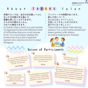 TADOKU is a reading activity whereby one will choose a book from the vast selection of graded reading materials and discover the joy of reading in Japanese. You will be able to deepen your understanding towards Japanese language, culture, society etc. through TADOKU activity. It’s a fun way to learn and totally different from the approaches of intensive reading and reading comprehension.