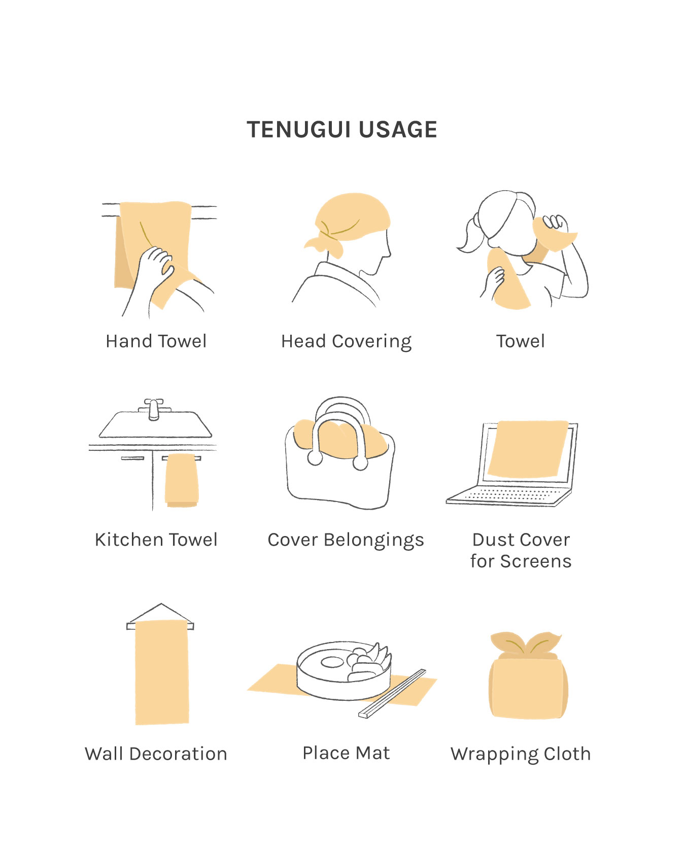 Tenugui is an endlessly useful and versatile towel and is used not only as a washcloth or dish cloth but also often used as a gift, headband, souvenir, decoration, wrapper for bottles and other items.