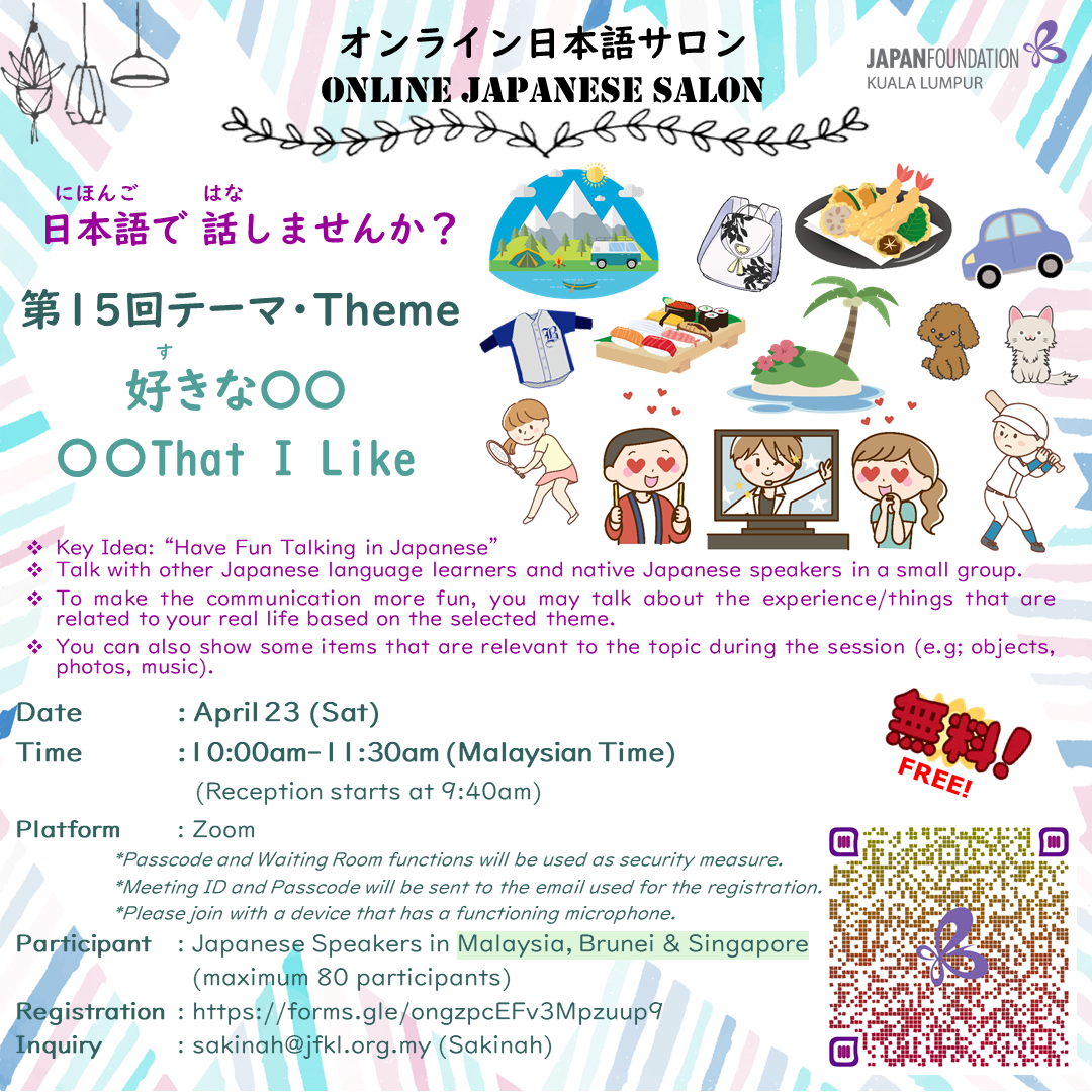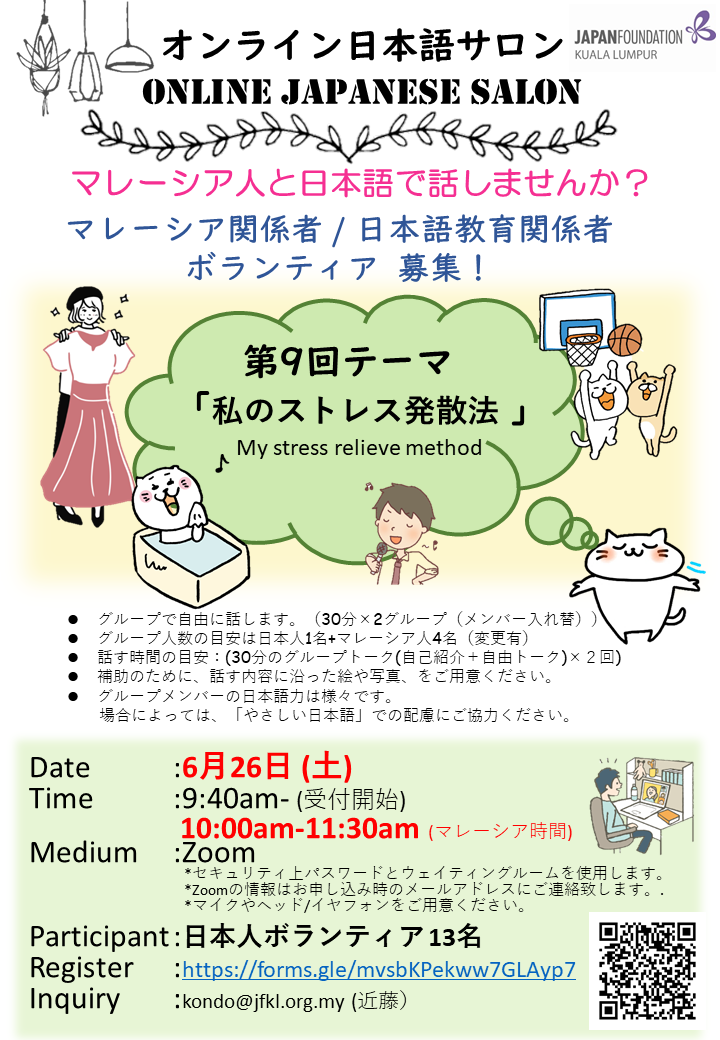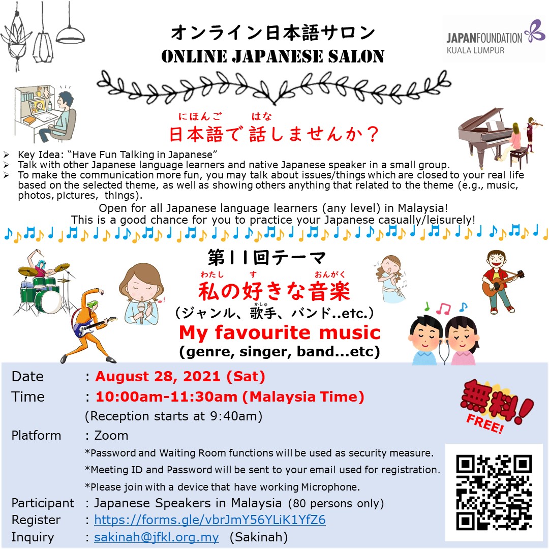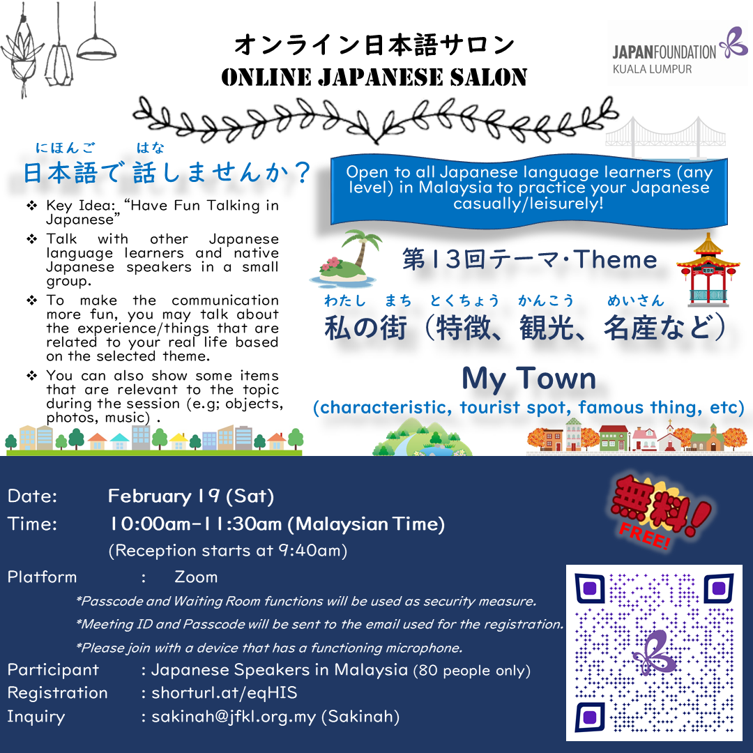 Well, we know that learning a foreign language is a lonely journey because you could hardly practice the language you learnt. We can feel you! That’s why JFKL has come out with a new event, namely ONLINE JAPANESE SALON, which is a virtual space (online) for you to gather and talk with other Japanese language learners in Malaysia in Japanese! The more exciting news is: You will also get the chance to talk with native Japanese speakers as well!
