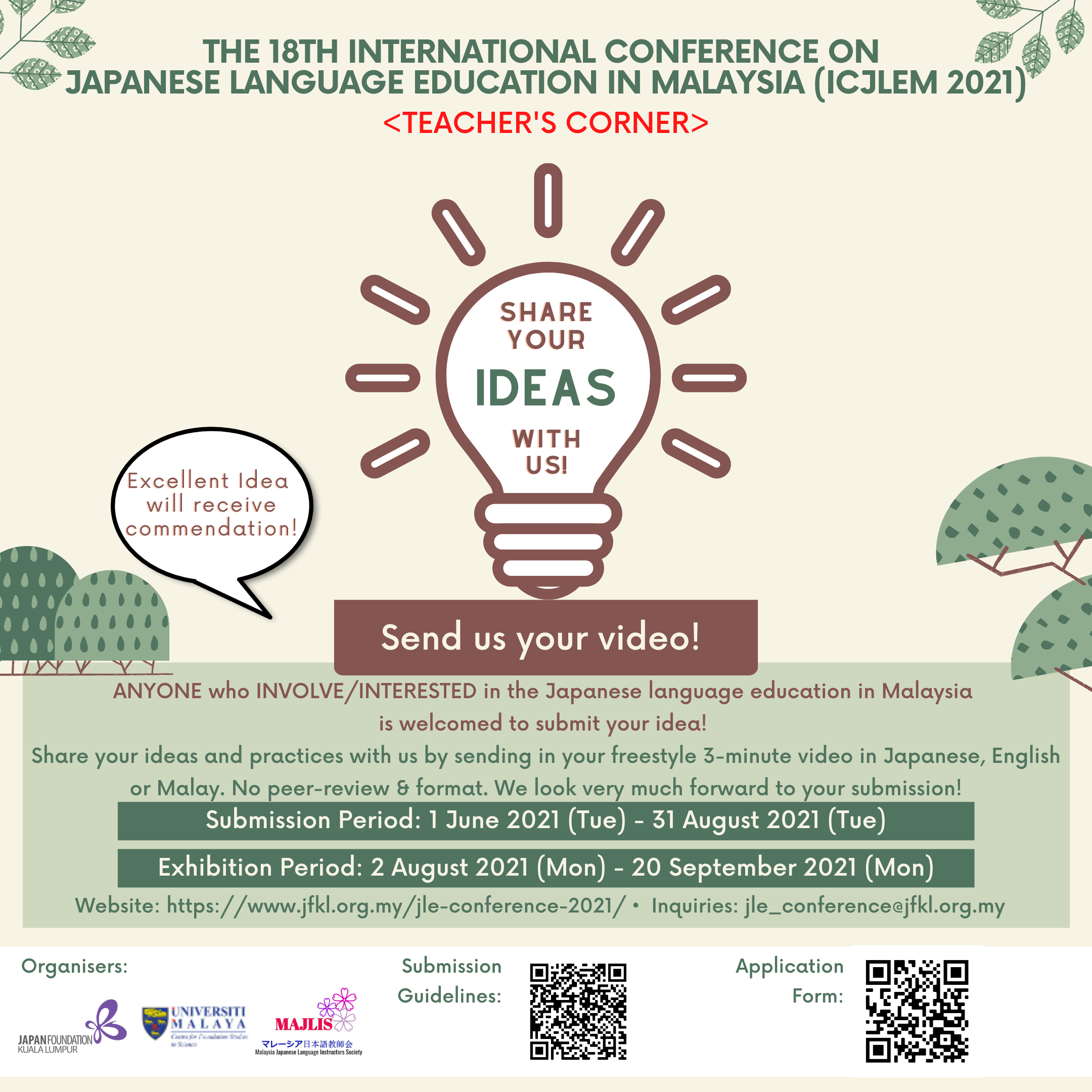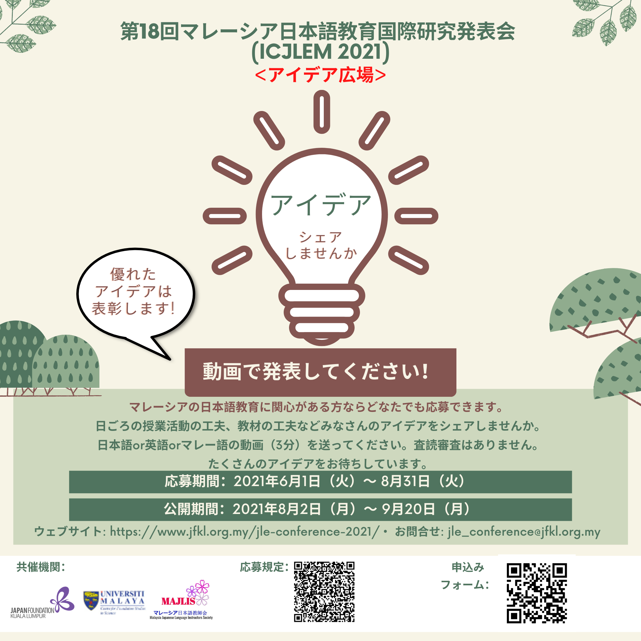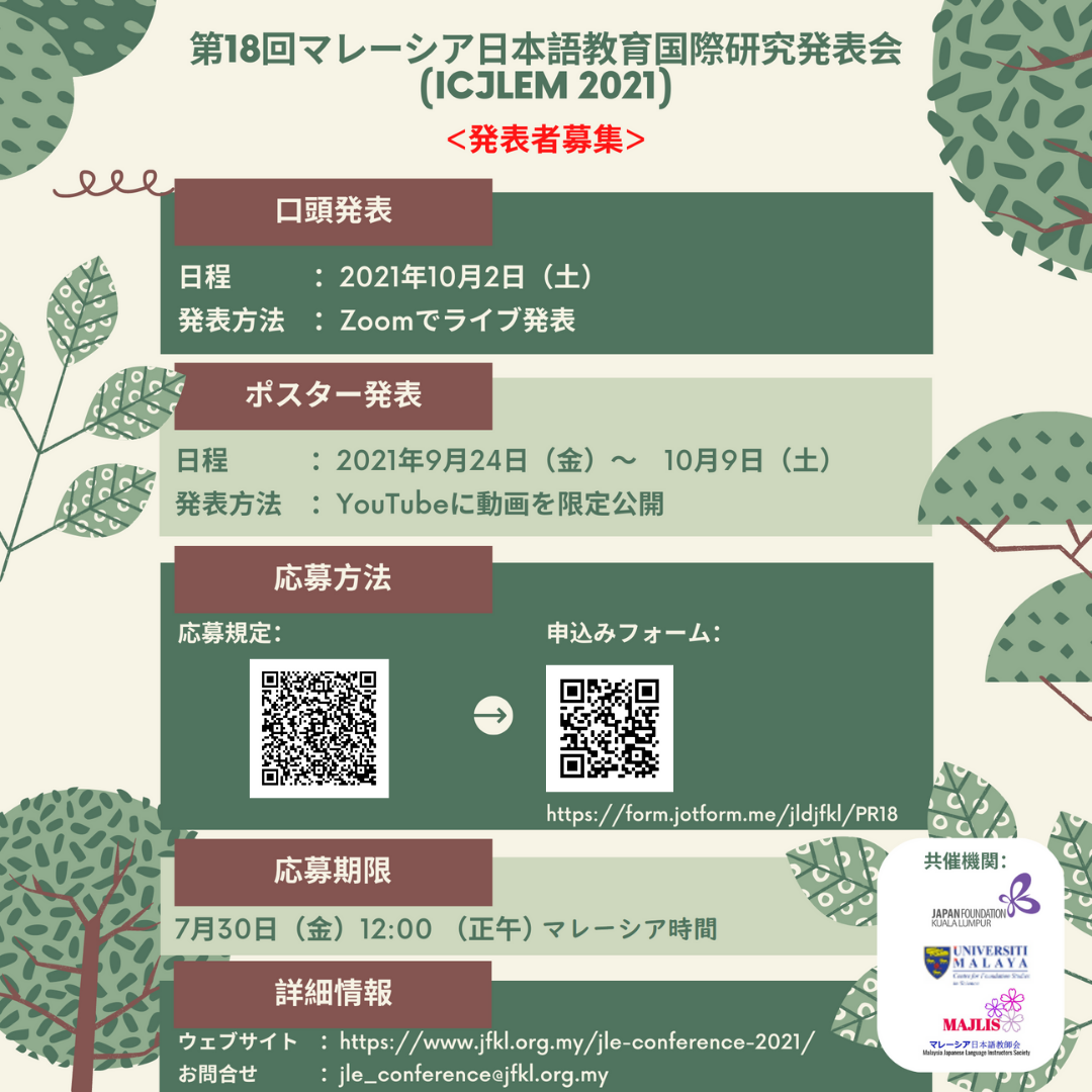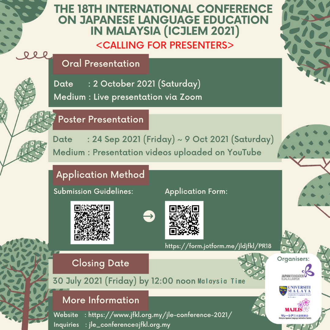 2021年度のマレーシア日本語教育国際研究発表会は、 オンライン開催になりました! 「アイデア広場」が帰ってきます! |